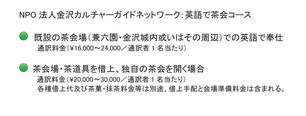 金沢の伝統文化を受け継ぐ各種建築、庭園、神社、茶道、街並、工芸を知識豊かな英語・中国語・日本語ガイドが紹介。