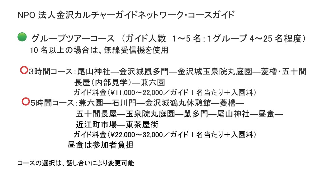 金沢市地域通訳案内士やベテランガイドが団体やグループを対象としてご希望の見学コースをご案内。